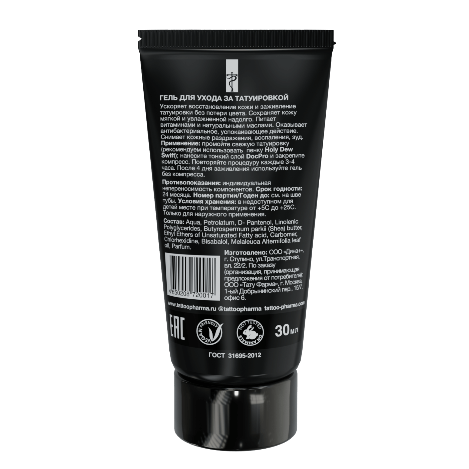 Комплекс витаминов и масло ши активно питают кожу, а минеральная основа обеспечивает продолжительное увлажнение поверхности свежей татуировки.