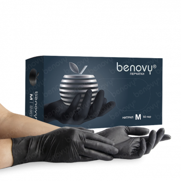 Перчатки черные нитриловые, неопудренные, текстурированные на пальцах.